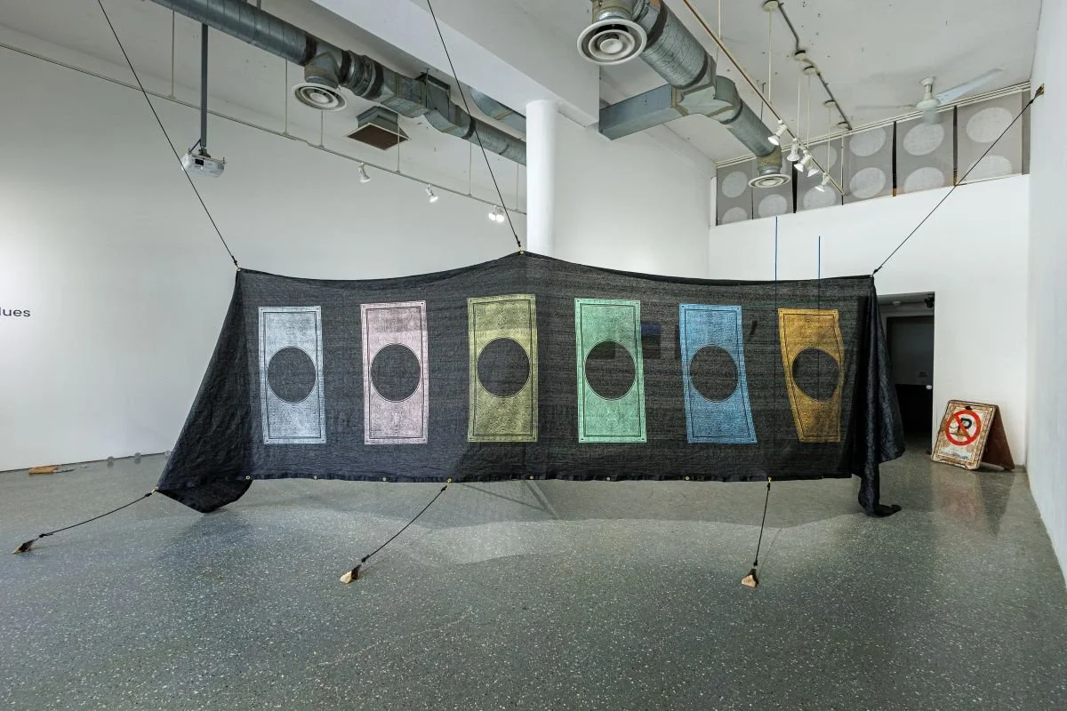 The recurring banknote pattern from the board game, Monopoly, serves as an explicit critique of capital’s control over spatial relations. It carries through the exhibition, adorning a traffic barrel, cast coins scattered across the floor of the gallery, and a construction privacy mesh.